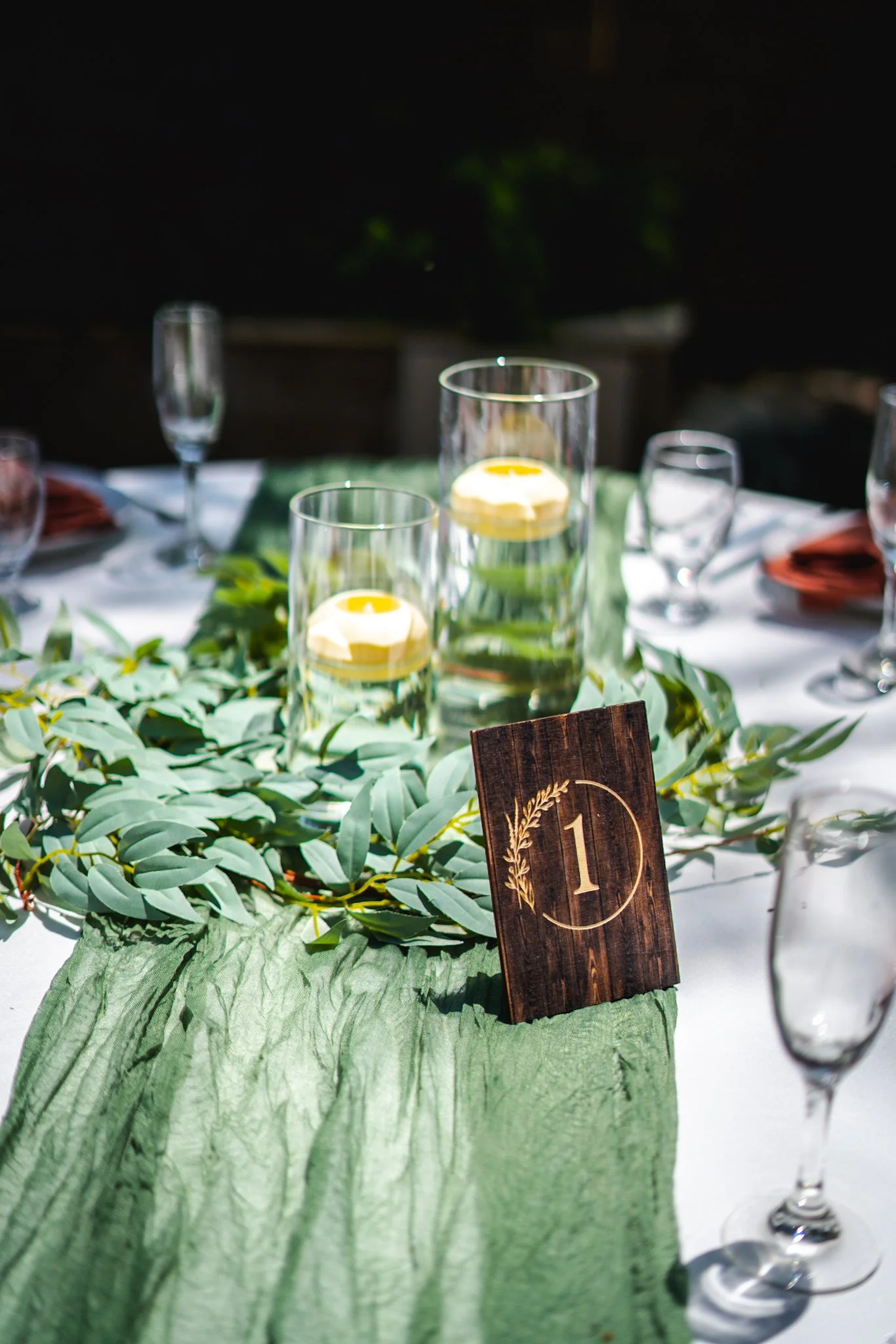 Elegant wedding reception table with a green rustic table runner, glass candle holders with floating candles, a wooden table number sign with the number 1, and lush greenery.