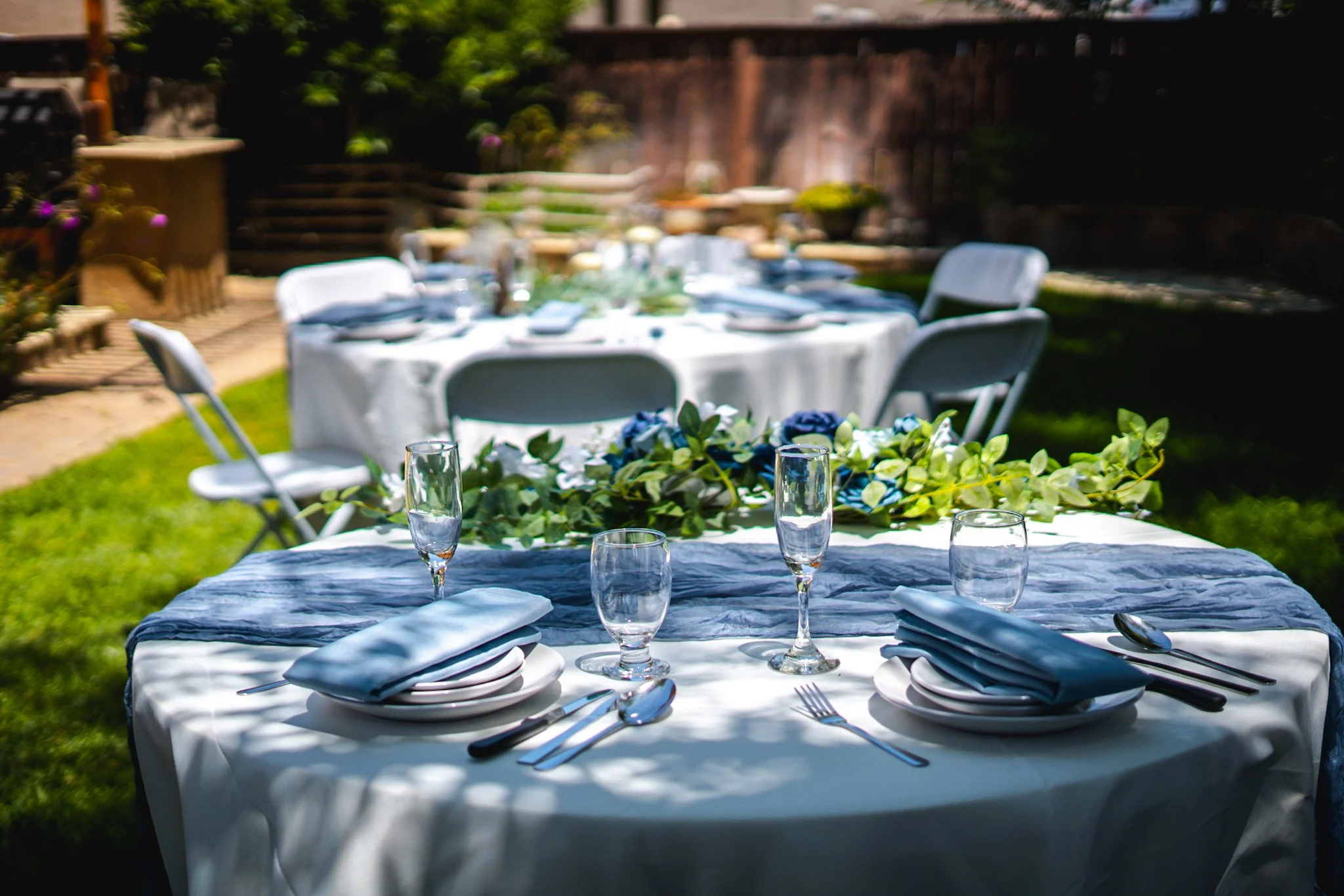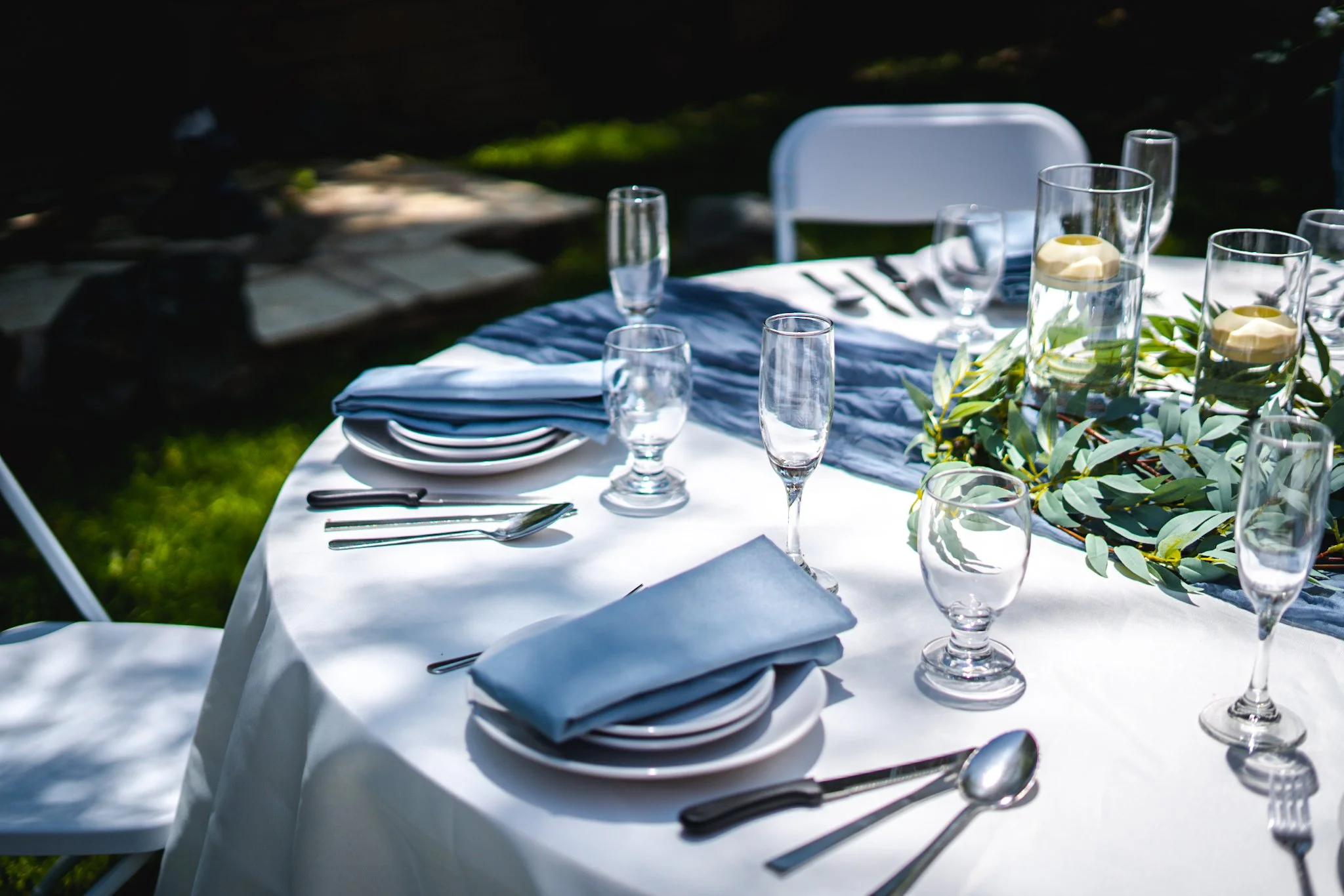 Outdoor dining setup with a white tablecloth, blue napkins, champagne glasses, and a lush green centerpiece, in a backyard setting with trees and a brick wall in the background.
