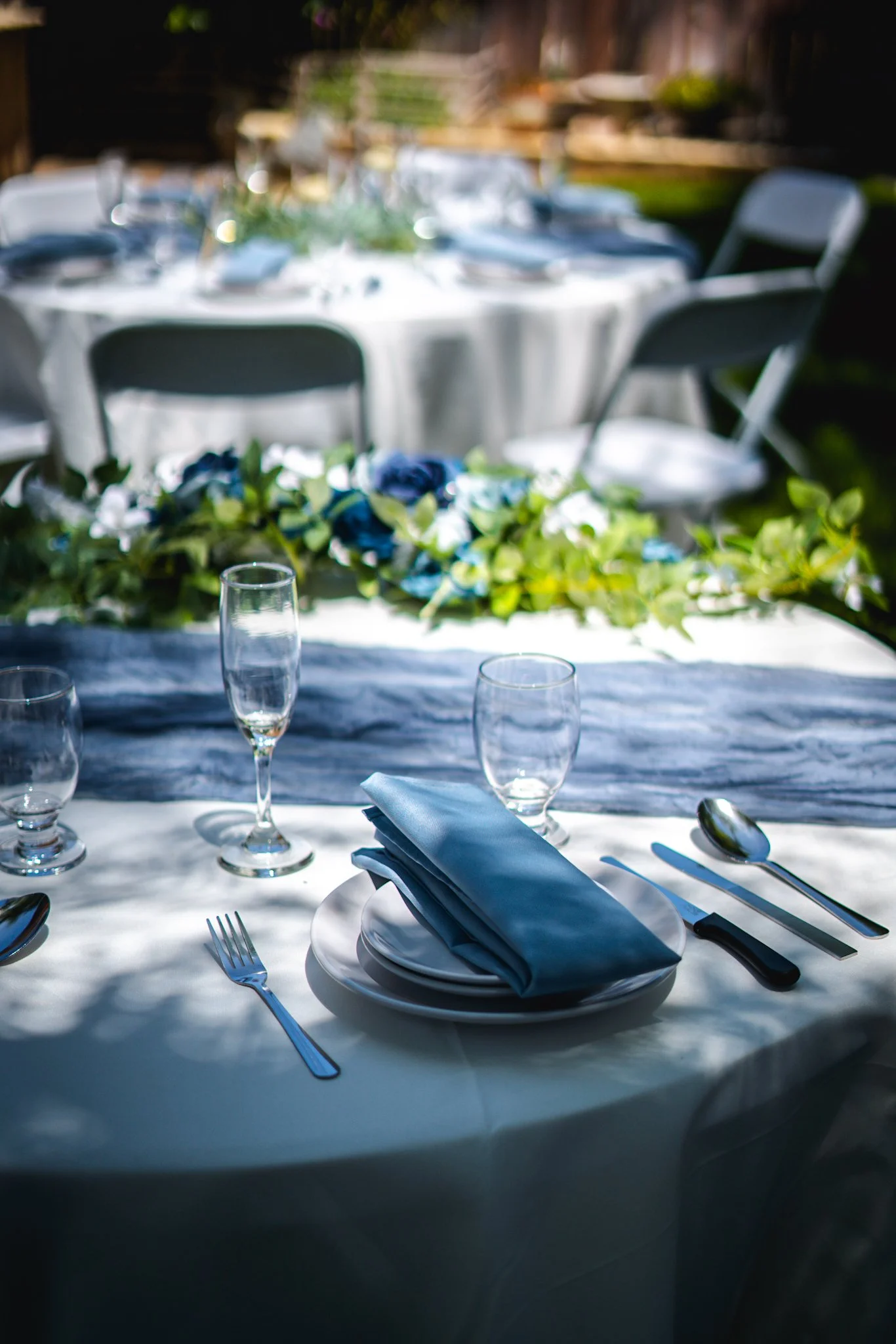 Elegant round outdoor table set for a formal event with white tablecloth, blue napkins, glassware, silverware, a blue table runner, greenery centerpiece, and candles.