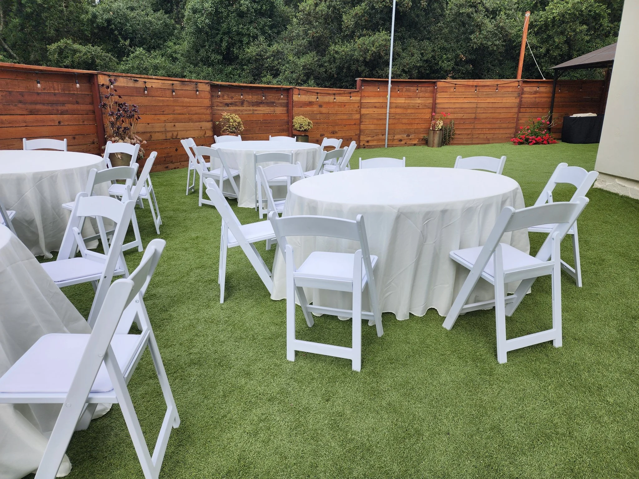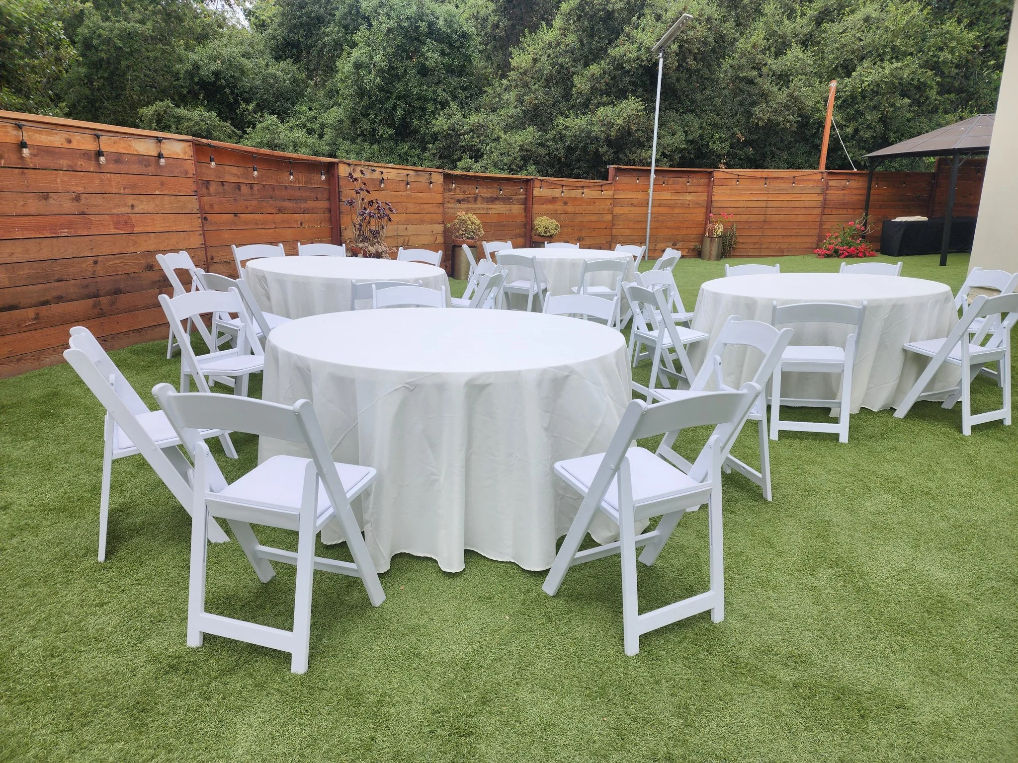 Outdoor party area with round tables covered in white tablecloths, white folding chairs, and a long wooden table with white chairs against a wooden fence on a grassy lawn.