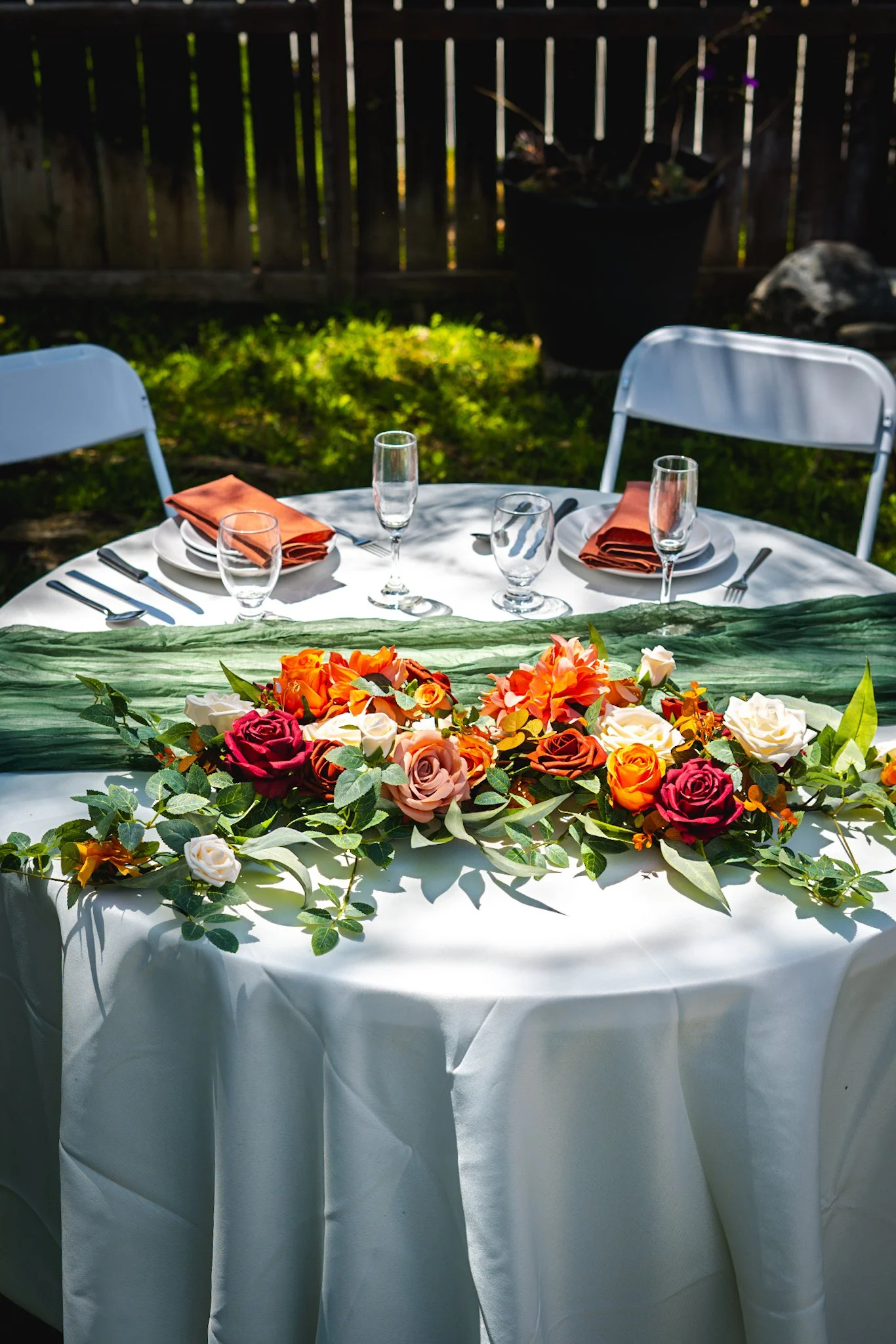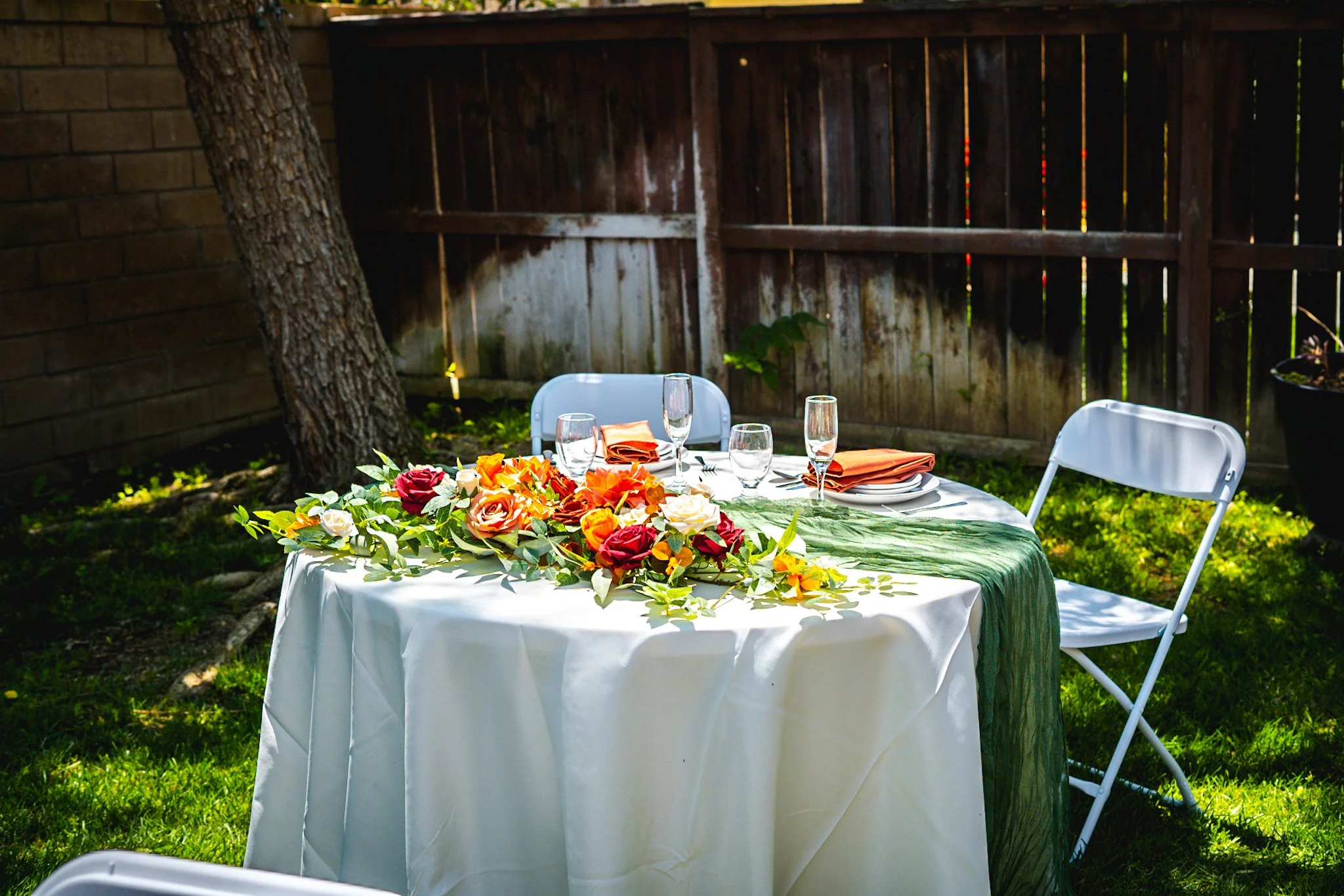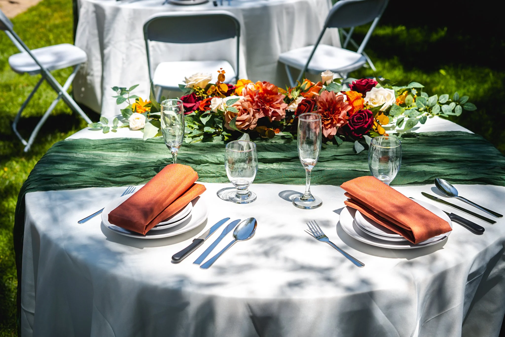 Outdoor dining table decorated with a white tablecloth, a green table runner, and a floral centerpiece with orange, white, and burgundy flowers. The table is set with four glasses, plates, napkins, and silverware. In the background, there is a white