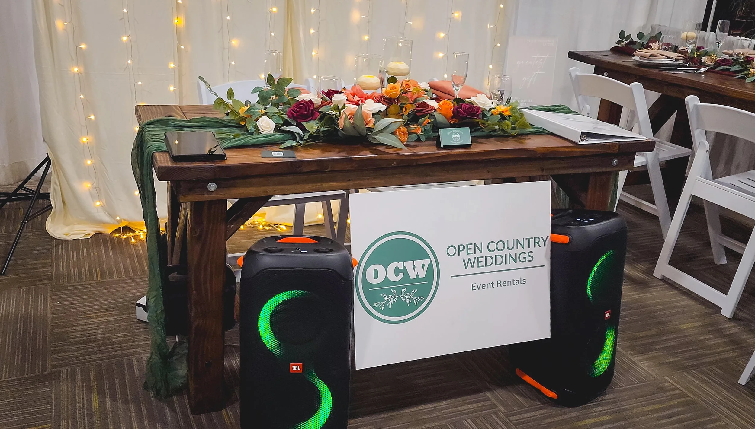 Wedding event table decorated with a floral centerpiece, plates, and glasses, displaying a sign for 'Open Country Weddings' with two large speakers on either side.