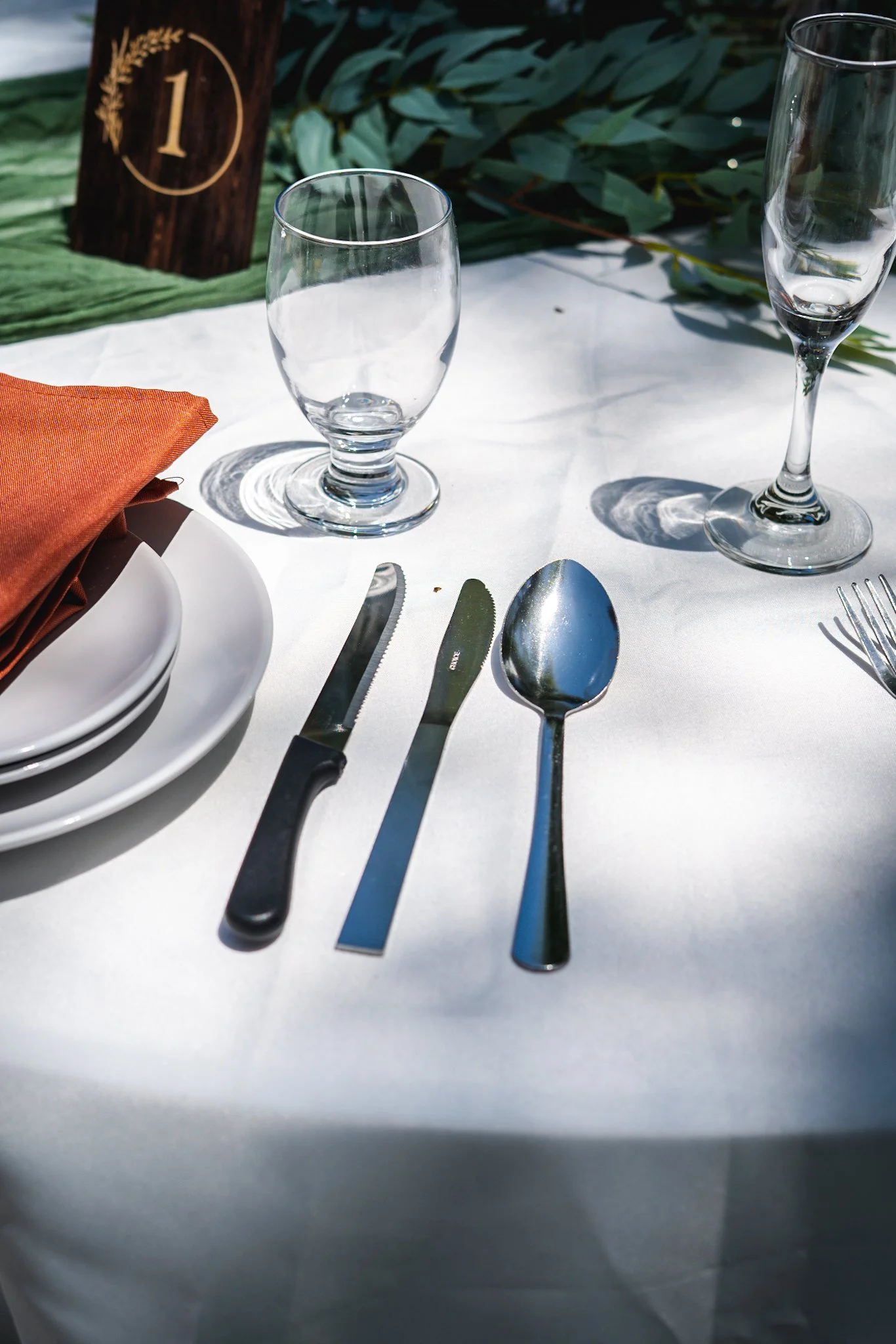 A formal dining table setting with a white tablecloth, a white plate stacked with smaller plates, an orange napkin, a knife, a butter knife, a spoon, an empty water glass, and a champagne flute. In the background, there is a wooden table number sign
