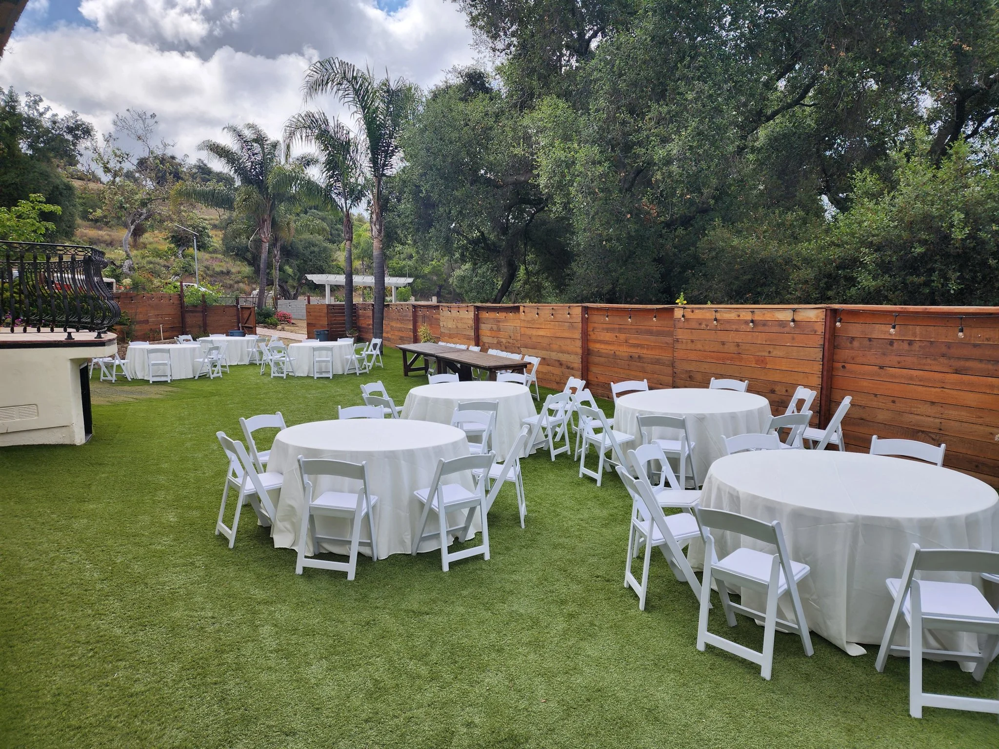 Outdoor lawn area with several round tables covered with white tablecloths and surrounded by white chairs, enclosed by a wooden fence, with some potted plants and a grassy background.