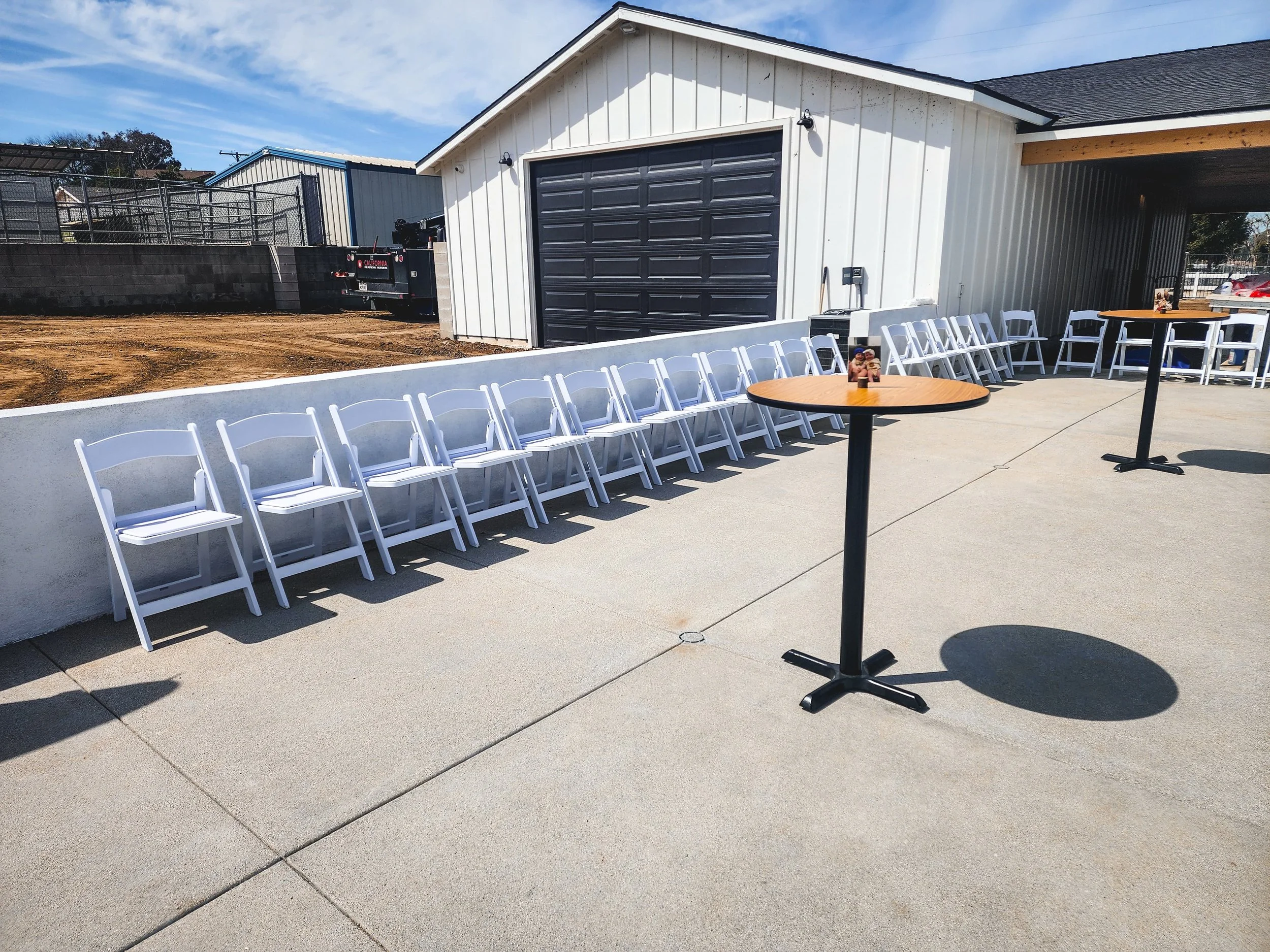 Outdoor event space with white folding chairs lined up against a white wall, with round wooden tables and a black shed in the background under a partly cloudy sky.