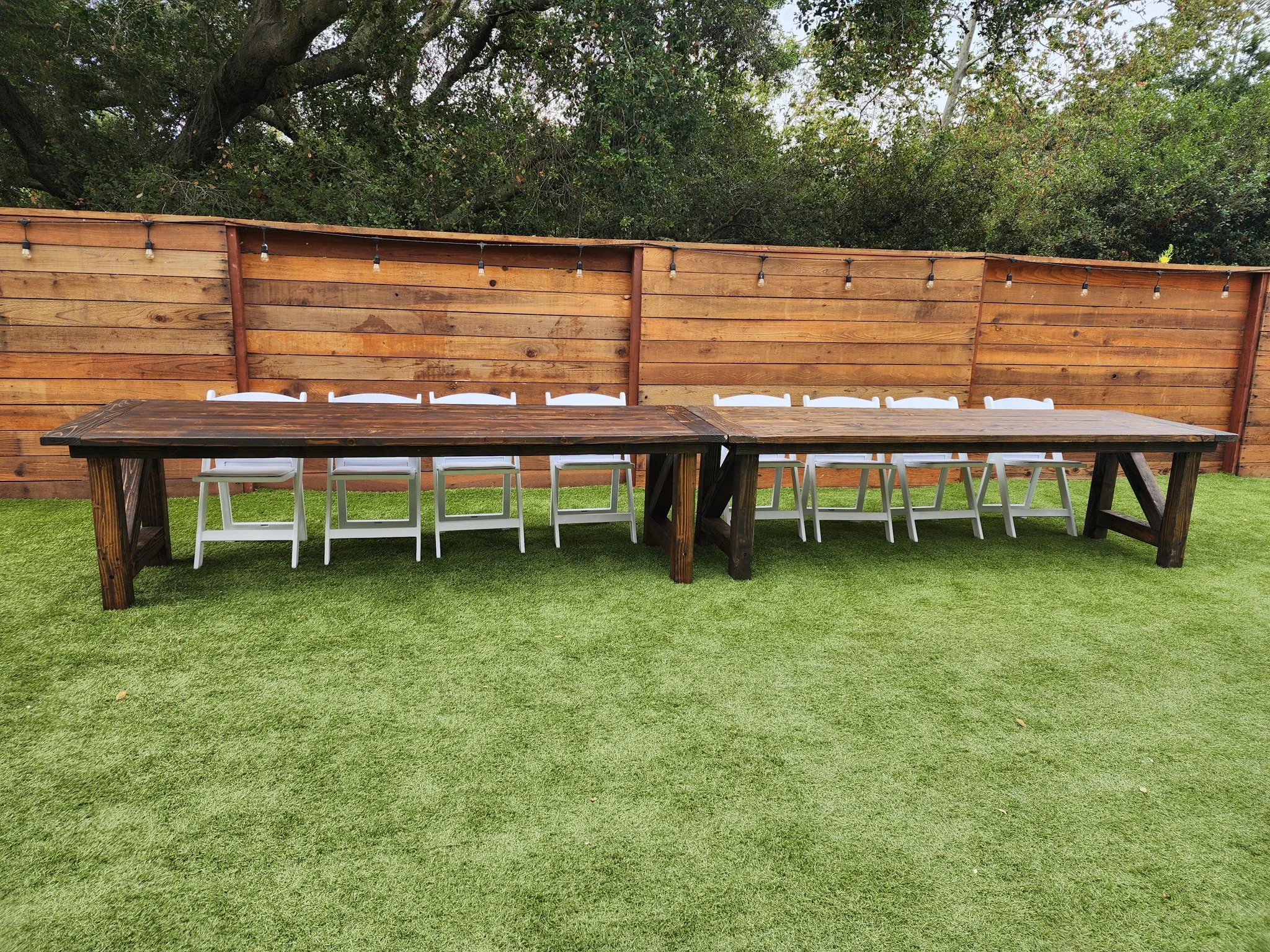 Long wooden table with white chairs behind it on grass lawn, enclosed by a wooden fence with string lights, and trees in the background.