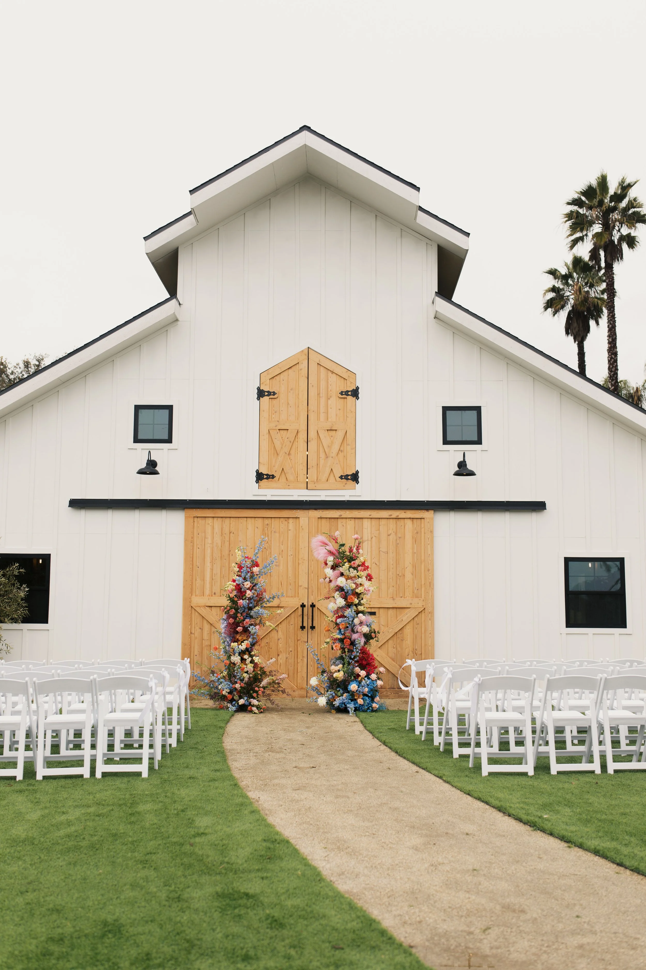 Outdoor wedding setup with white chairs arranged on either side of a dirt aisle leading to a barn with wooden doors, decorated with colorful floral arrangements.