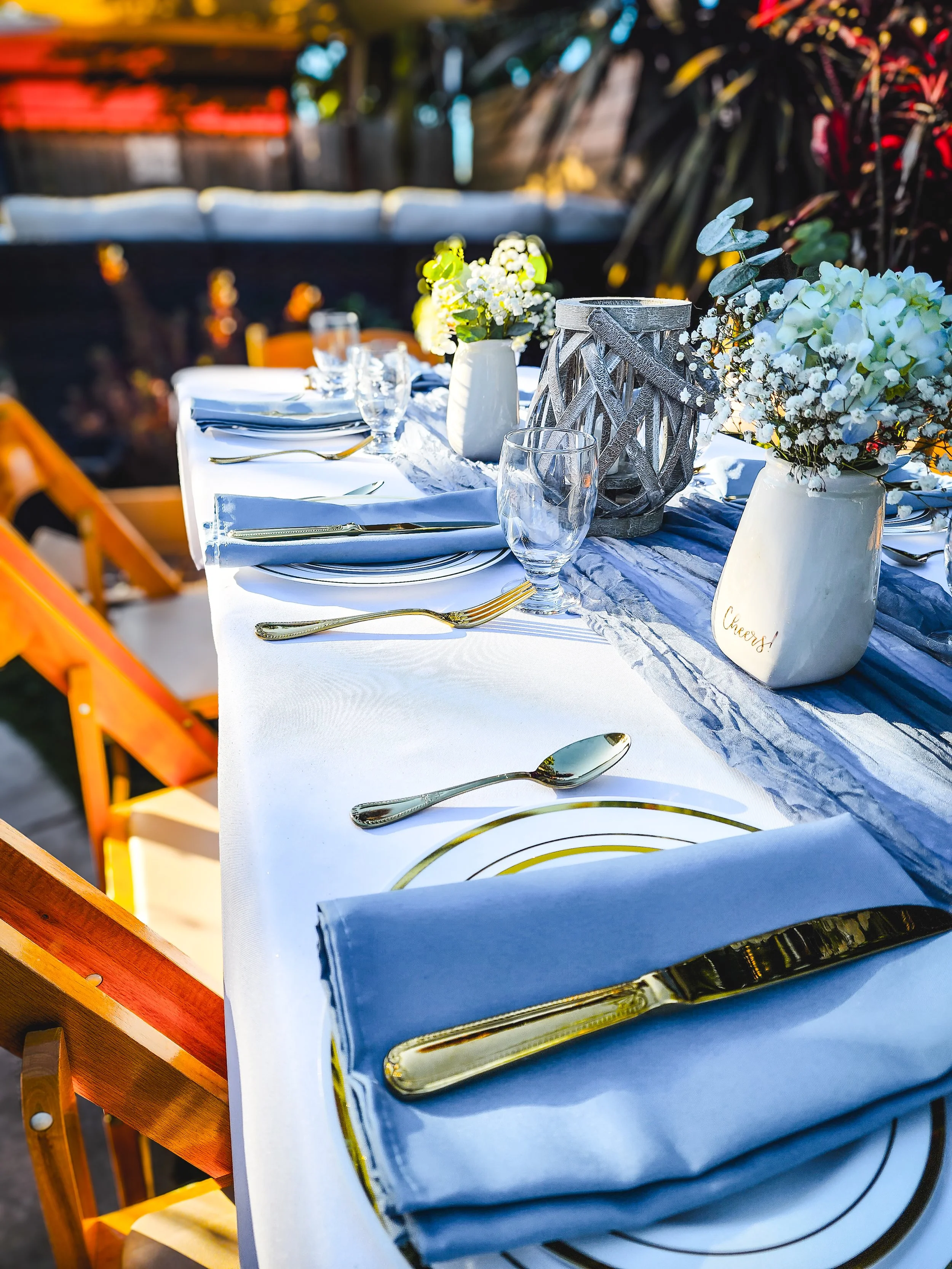 Elegant outdoor table setup with a white tablecloth, decorated with a blue and white floral centerpiece, and set with glassware, plates, and napkins.