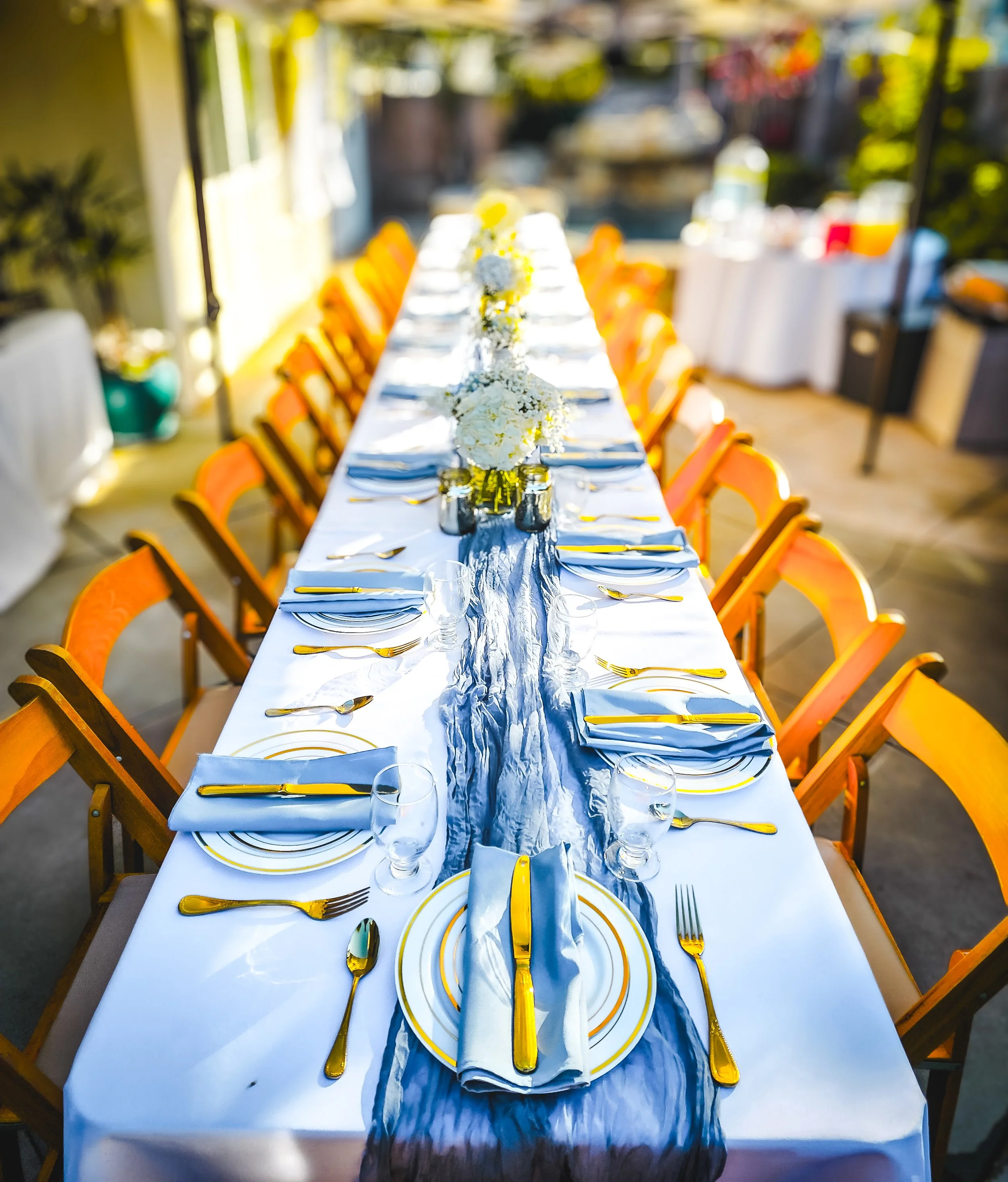 Long rectangular outdoor dining table set with white tablecloth, blue runner, white floral centerpieces, yellow-handled cutlery, clear glasses, and orange chairs, in a garden setting.