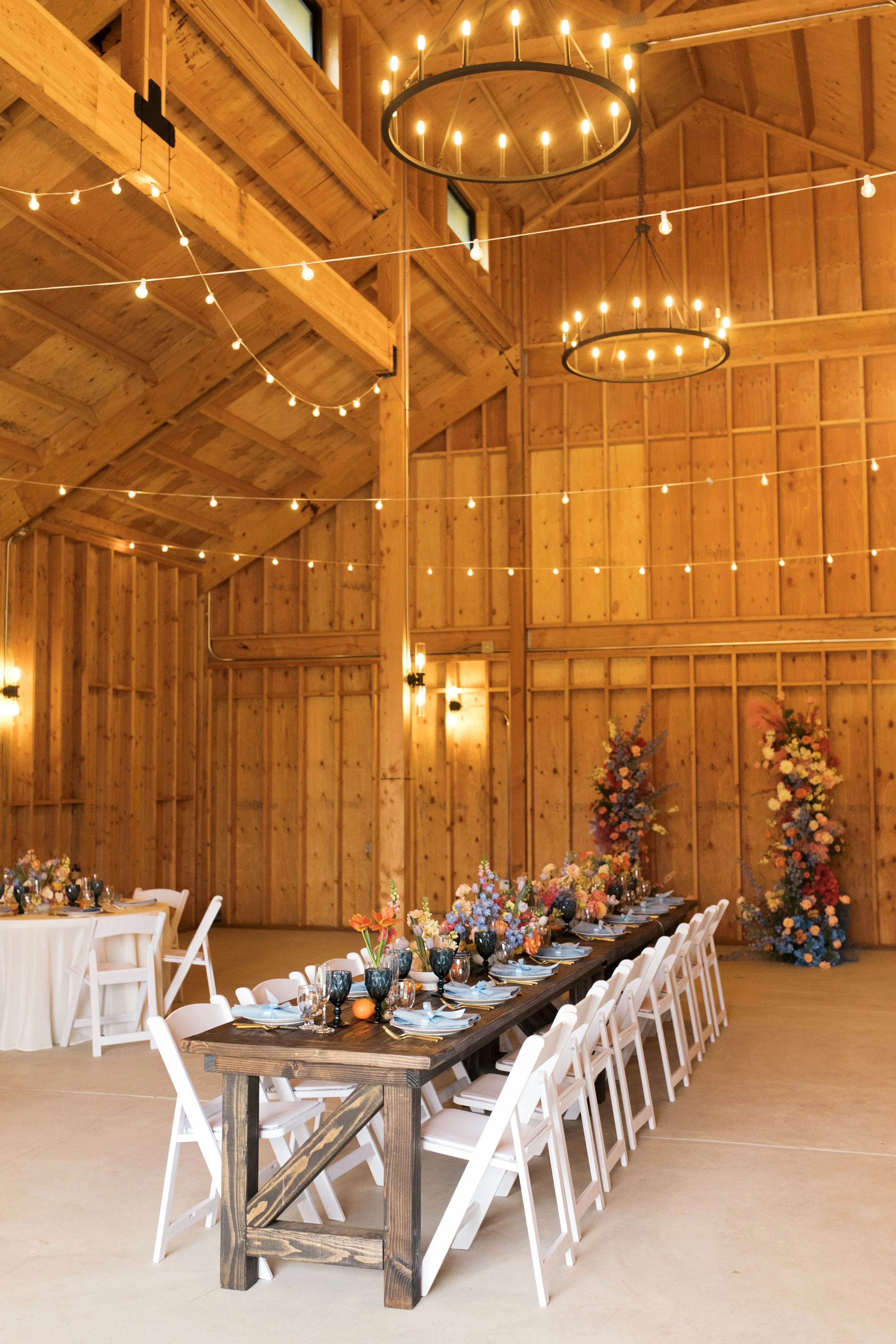 Wedding reception inside a rustic wooden barn with a long dining table decorated with colorful flowers, black glasses, and white plates, illuminated by string lights and chandeliers.