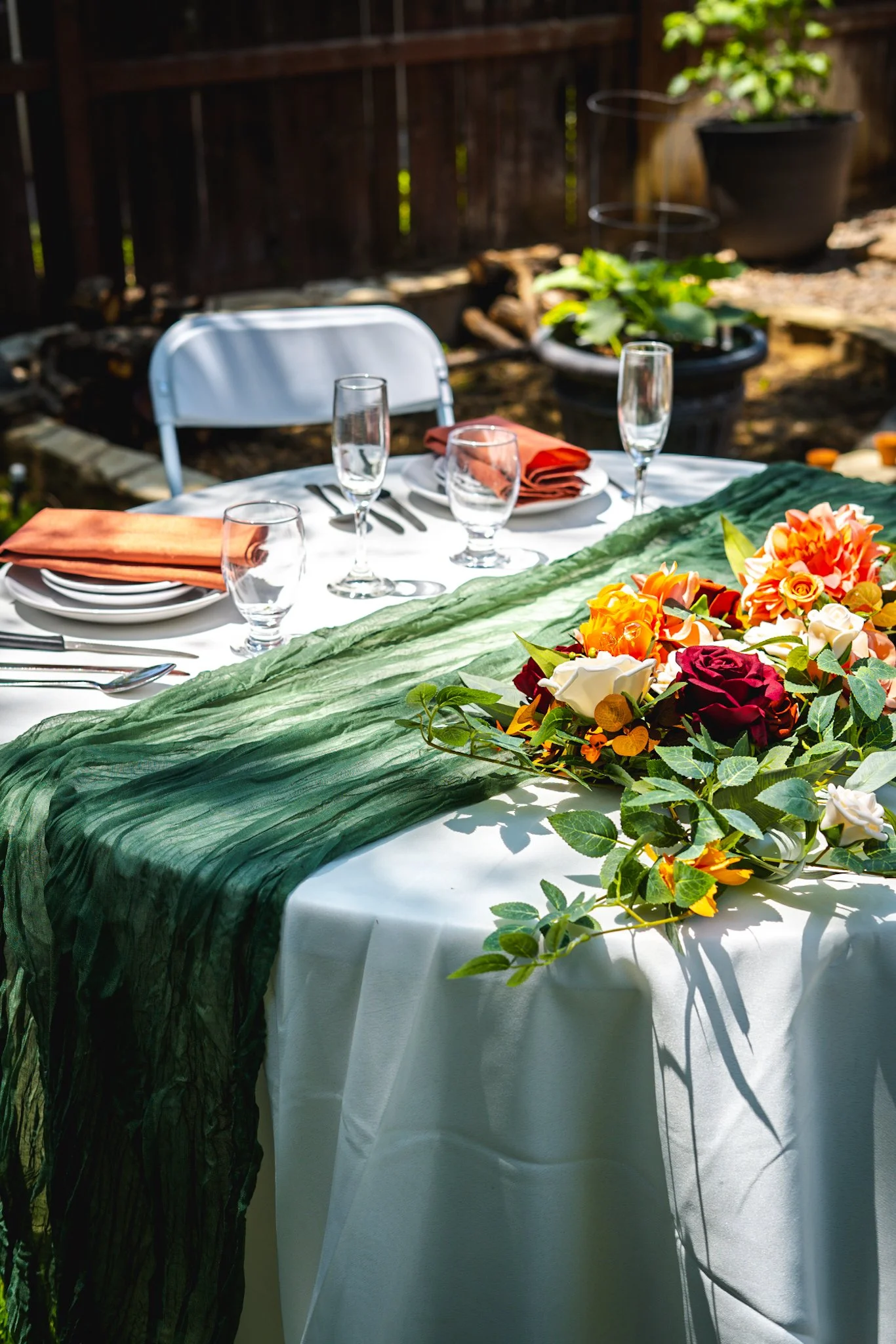 Outdoor dining table decorated with a green table runner, floral centerpiece with orange, red, and white flowers, set with glassware, plates, and cloth napkins.