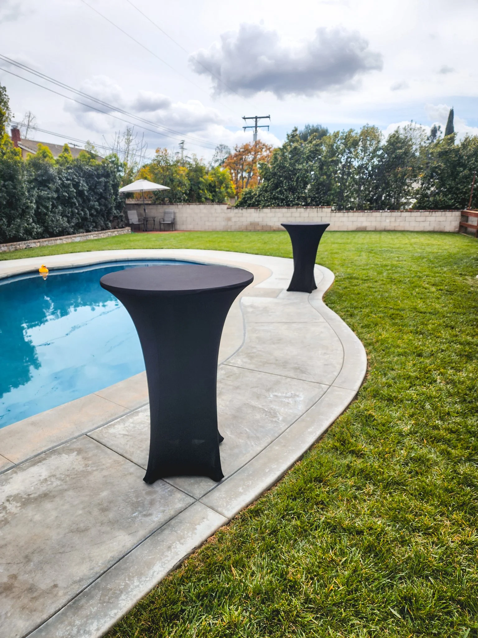 Outdoor patio with round tables covered with black tablecloths, set by a swimming pool, with chairs around the tables and a grassy backyard with trees and a brick wall.